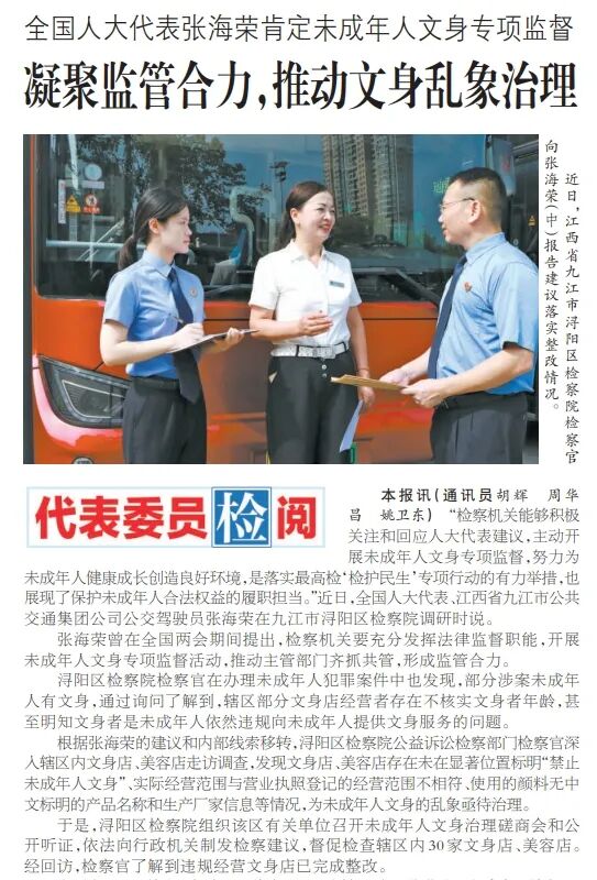 “检察机关能够积极关注和回应人大代表建议,主动开展未成年人文身专项监督,努力为未成年人健康成长创造良好环境,是落实最高检‘检护民生’专项行动的有力举措,也展现了保护未成年人合法权益的履职担当。”近日,全国人大代表、江西省九江市公共交通集团公司公交驾驶员张海荣在九江市浔阳区检察院调研时说。